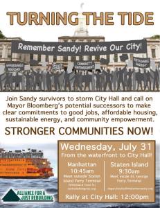 The action will start at 10:45am outside the lower Manhattan Staten Island Ferry Terminal, where delegations from communities hit hardest by the storm will converge. From there we’ll start a procession up Broadway towards City Hall to tell Mayor Bloomberg — and the people who want to replace him — what kind of rebuilding we demand.
