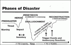 These stories and data counter the traditional view of the temporality of disasters. The image above is was first published* in a Training Manual for Mental Health and Human Service Workers in Major Disasters published in 2000, and is currently used by the Center for Disease Control and various crisis counseling services for disaster survivors. Yet, rather than a teleological climb back to normalcy, there are two ways that many on-the-ground experiences of Sandy create a different temporal pattern. First, people who were relatively resilient and able to deal with adversity before the storm are now vulnerable. Secondly, for populations that were already vulnerable due to poverty, lack of access to health care and education, and precarious employment or housing, not only are they in increasingly dire situations, but a return to “predisaster” normalcy can hardly be called a recovery.