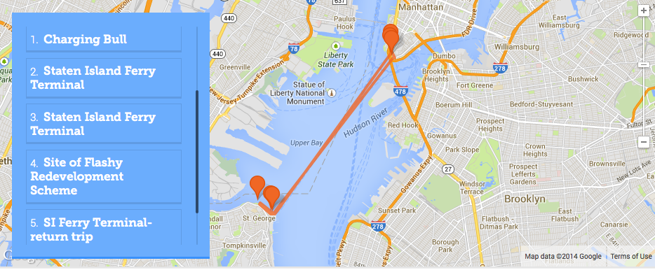 Magicians use misdirection to draw our eyes away from their sleight-of-hand. The best can rob us blind, while dazzling us till the bitter end. Since Hurricane Sandy flooded Staten Island’s Southern and Eastern shores, residents have struggled to rebuild their lives, often in vain. Wall Street has been there at every step. Our walk begins at the charging bull, where we dissect the little-known ways Wall Street contributes to the climate change behind Sandy’s destructive force. Then, on the Staten Island Ferry, we describe Sandy’s aftermath for Staten Island residents, and how complex financial instruments—insurance schemes, mortgages, loans—have prolonged the storm’s disastrous wake and kept homeowners from rebuilding. Off the ferry, during a quick stroll on the St George Waterfront, we explore what is being built with Wall Street’s backing: a designer outlet mall, the hemisphere’s largest ferris wheel, a luxury hotel—and a sustainability museum. Riding the ferry back, we debate ways of breaking the spell, while drinking some of New York’s cheapest beer.